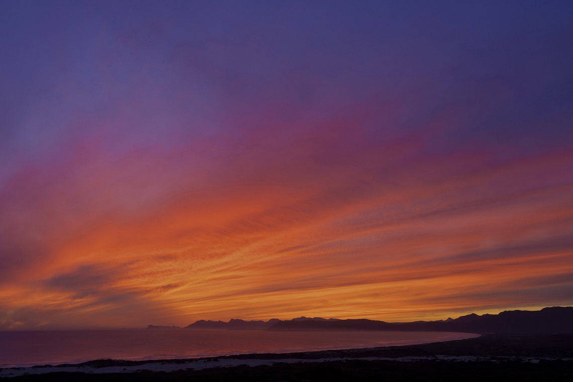 A vibrant warming burst of colour as the sun sets over the ocean and Walker Bay. Spectacular hues of yellow, orange and pink paint the blue canvas of the sky and we head towards night. The last of the warm glow of the sun slips behind the horizon as the brilliant colours gives us one last show. And not only day but also twinkling night sky is something to behold.