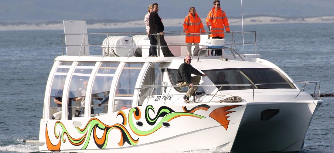 The tour starts at our Orange office on your right-hand side as you enter the New Harbour. You will be welcomed by our friendly office staff, who will set the scene for a memorable trip. Our clean, comfortable bathroom facilities are available for your convenience. You will love the beautiful view over Walkerbay during the 2-minute walk down to the boat. Once on board, one of our guides will give an orientation briefing about the trip, safety and facilities on board as well as the marine wildlife we can expect to encounter.