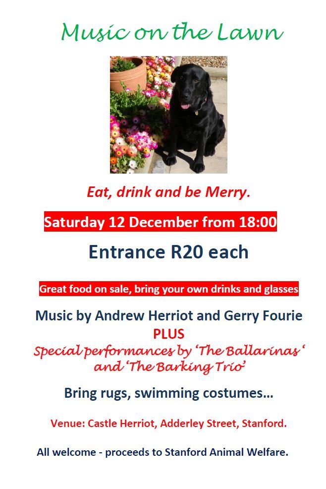 Stanford Animal Welfare Society presents Music on the Lawn on Saturday 12 December 18:00 at Castle Herriot , Adderley Street, Stanford.